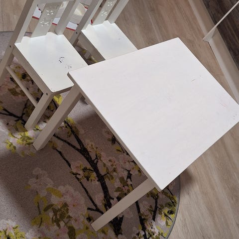 Ikea Lätt lasten pöytä ja kaksi tuolia. Toisesta tuolista lyhennetty jalkoja. Muuten siistissä kunnossa, mutta kulmista en saanut värikynän jälkiä ainakaan nopealla pyyhkäisyllä pois.
