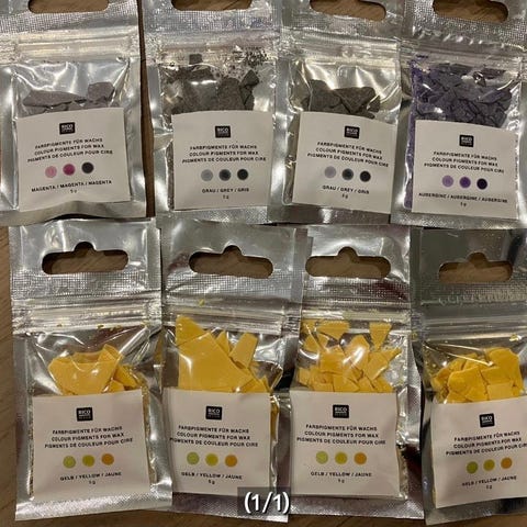 Pigmentit pusseissa epäsäännöllisinä paloina, ja ne on sulatettava vahaan. Pussin sisältö riittää noin 500g kynttilävahaan.