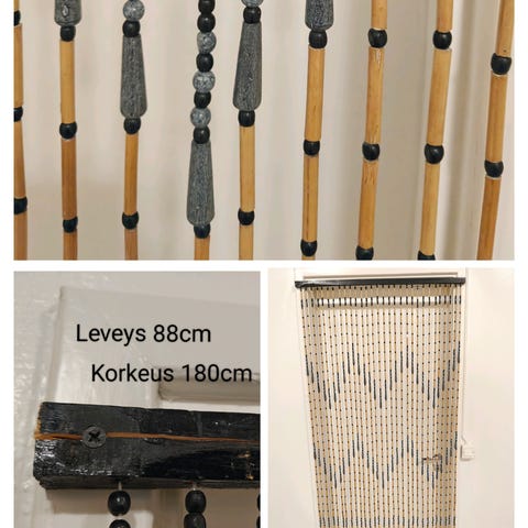 Itsetehdyt kultaiset bambu paneeliverhot, jotka kääntöpuolelta valkoiset, 2 kpl yhteishintaan. Molemmissa päädyissä puiset pyörölistat, jotka helppo asettaa koukuista roikkumaan.