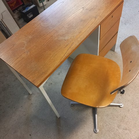 Puinen työpöytä hyllyllä ja vetolaatikolla