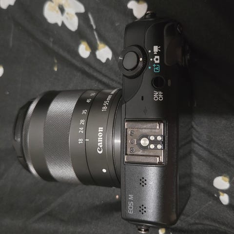 Canon EOS M peilitön kamera musta. Mukana Canon 18-55mm ja EF-M 22mm objektiivi, 32 GB muistikortti, akkulaturi ja kantolaukku. Kamera soveltuu valokuvaukseen ja videokuvaukseen.