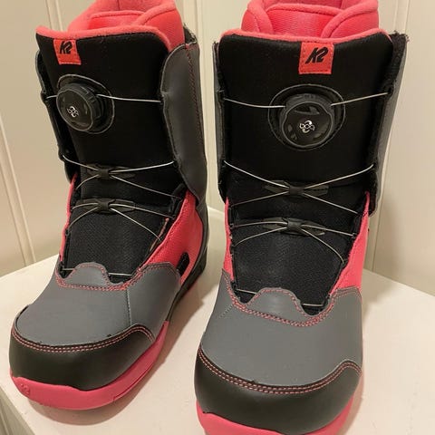 K2 Mini Turbo lumilautakengät lapsille, koko 34,5 (UK 8, EUR 345, CM 27). Mustat kengät, joissa siniset yksityiskohdat ja kiristysjärjestelmä. Käytetyt lumilautakengät, sopivat lumilautailuun. Vilkkuvat kantapäistä kun kävelee.