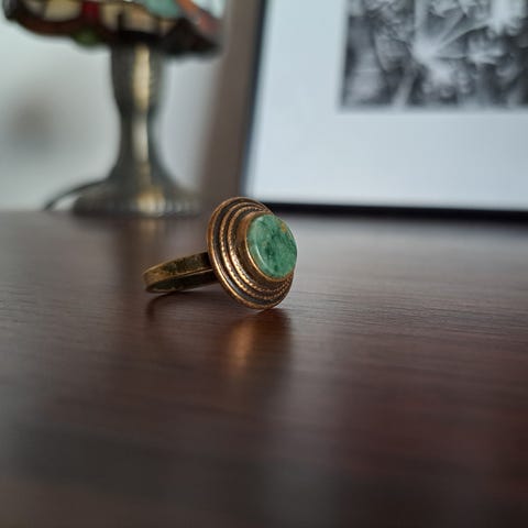 Kalevalakorun Sancta Birgitta pronssinen sormus. Kivi keskellä on tummanpunainen. Korun leveys on noin 0,6 cm. Koko/sormuksen leveys noin 1,8 cm.