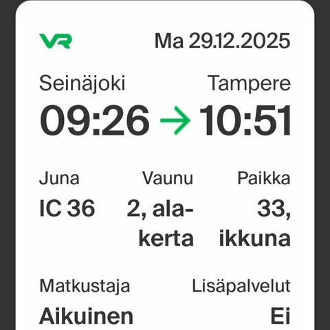 Meno 16.1. klo 8.35-11.39 ja paluu 18.1. klo 14.20-17.16