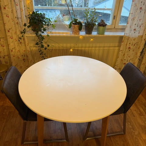 Annetaan pyöreä ruokapöytä uuden tieltä pois. Pöydässä käytön jälkiä, mutta jäljet saa peitettyä vaikka pöytäliinalla. Nouto Herttoniemestä.