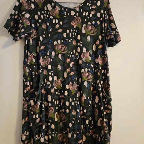 Vähällä käytöllä ollut taskulla en tunika kukkaiskylpykuosilla. Edessä taskut. Koko xl.
