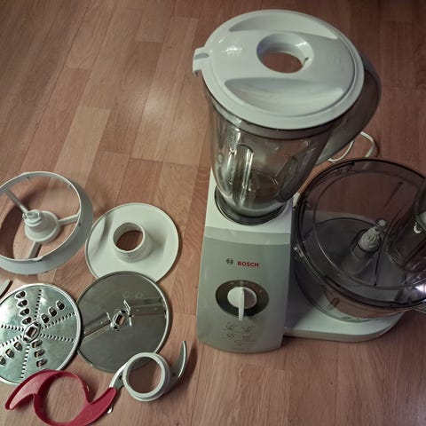- Bowl and mixing paddles (kulho, roiskesuoja, vispilä, taikinakoukku)