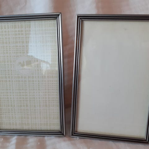 Kaksi metallista hopeanväristä vintage valokuvakehystä. Samaa sarjaa, eri kokoa.