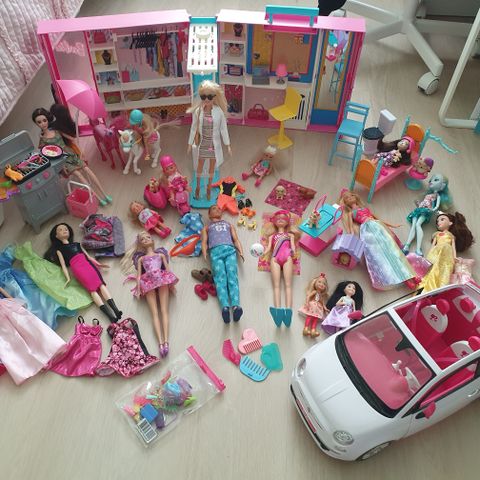 Myydään kuvan barbiet. Talo, auto, sohvakalusto, barbit, keinu, kissat ja koirat. Ja muuta tavaraa.
