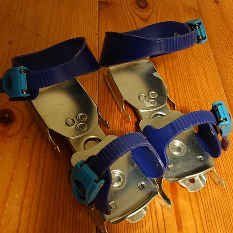 Harjoitteluluistimet, jossa on kaksi terää. Pohjan pituus on säädettävissä ruuvin avulla. Solkikiinnityksellä luistin menee suoraan kenkään.
