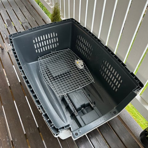 9 erikokoista kuljetusboksia, 7 31l iisiä (osa paikattuja), 6 isoa samlaa, 6 31l smarttia, kaksi 60l boksia, rehuloota, 7 juomapulloa, pari mökkiä. Boksit modattuja, yhdessä samlassa ei verkkoa, osaa paikattu. Extra kansia ja pohjia kuljetubokseihin.