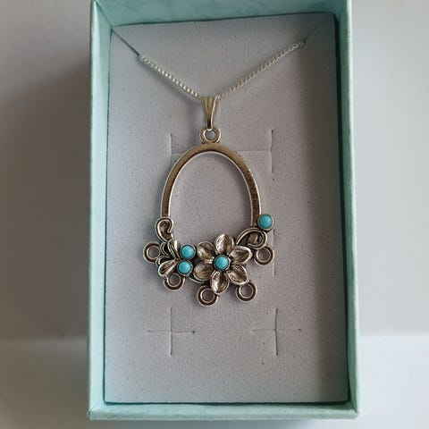 Kaunis ja Siro kaulakoru Kukat ja Perhonen Turkoosi kivillä,korun halkaisija on 2cm ja ketjun pituus on 50cm,925 leima ketjussa,lahjarasia tai lahjapussi.( Turkoosi tuo mukanaan henkisyyttä, rohkeutta, tunne-elämän tasapainoa, voimaa antavia ystävyyssuhteita, rakkautta ja romantiikkaa.Turkoosin avulla ajatukset selkiintyvät ja ihminen kykenee näkemään edessään oman tiensä.Turkoosi tasapainottaa jin ja jang-energioita,se edistää itsensä toteuttamista ja auttaa sinua saavuttamaan haluamasi elämäsi kaikilla osa-alueilla.Turkoosi kantaa ja luovuttaa energioita, jotka auttavat sinua elämään elämääsi totuuden, ylpeyden ja rehellisyyden kanssa) (Postitus kirjeenä tai nouto)