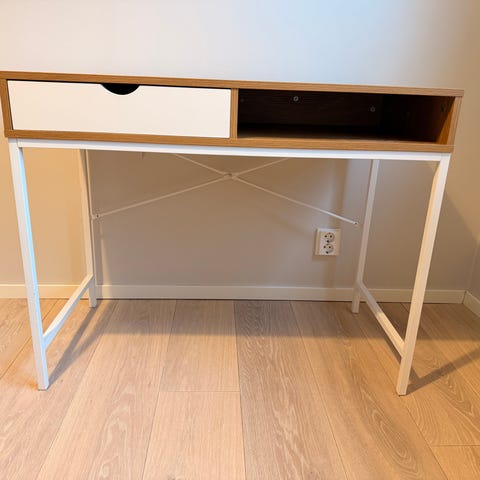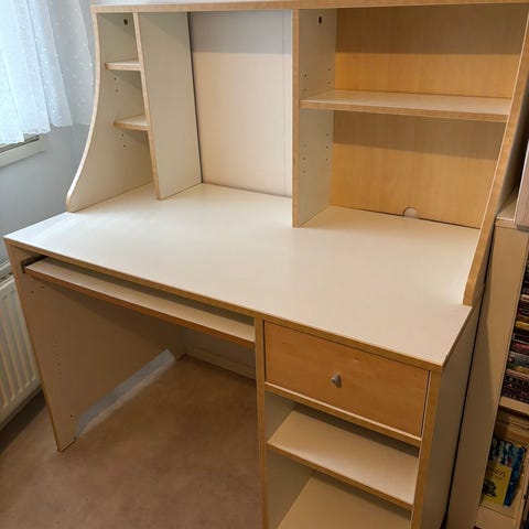 Korkeus säädettävissä, joten sopii lapselle sekä aikuiselle. Ei seisomakorkeutta. Kallistus minaisuus ja vetolaatikko.