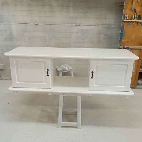 Myydään itse liimapuulevystä valmistettu sivutaso. Pinnijalat (40cm) bauhaussista. Toimitti meillä tv-tason virkaa. Välitaso on 20cm korkea.