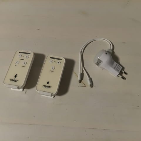 Pieni ja näppärä Capidi itkuhälytin. Helppo käyttää. Molemmat yksiköt langattomia. Akut hyvässä kunnossa. Laturi ei ole mukana (micro-USB laturi).