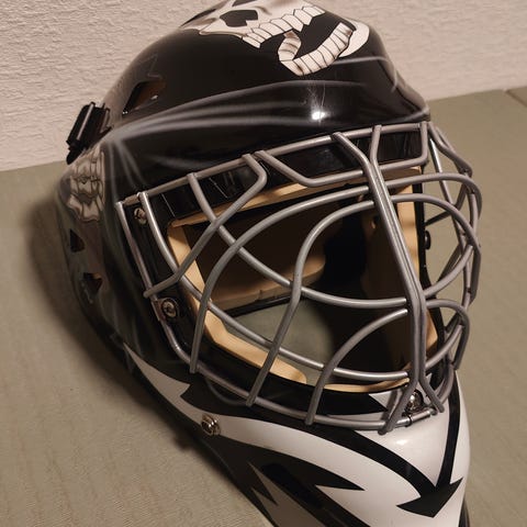 Wall Mask W2H JR jääkiekkomaalivahdin maski. Väri valkoinen, koko juniori; 54-57. Kirkkaan värinen ristikko. Hyvässä kunnossa; remmit ja pehmusteet ehjät. Mukaan kaulapleksi.