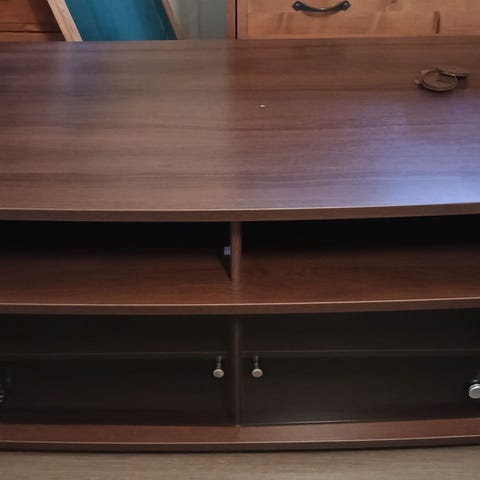 Askosta ostettu hyväkuntoinen tv-taso jossa kaksi vetolaatikkoa ja kaksi avattavaa.