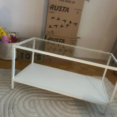 Ikean Lack sarjan sohvapöytä. Pari aivan pientä jälkeä pinnassa, mutta jäävät pöytäliinan yms alle.