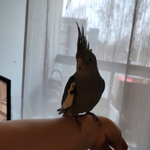 Tosi kaunis papukaija, sen värit on kuin aurinko kirkkaan keltaisena. Se on aktiivinen, tykkää leikkiä ja tekee vähän hauskoja temppuja. Se rakastaa omenoita. Ikää sillä on 2 vuotta ja se etsii uutta kotia.