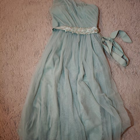 Pitkä 147cm olka/ helma pituus ja kokoa 38 vuorellinen juhlamekko joka kerran juhlissa ollut päällä.Materiaali 97% polyester ja 3% elastane. Takana pitkähkö halkio.