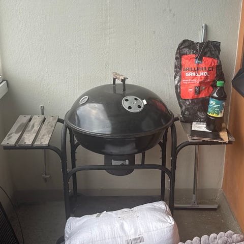 Metallinen hiiligrilli, jossa kansi ja ilmanvaihtoaukot. Sopii hiilien käyttöön grillaamiseen. Kompakti koko, helppo siirtää ja käyttää ulkona.