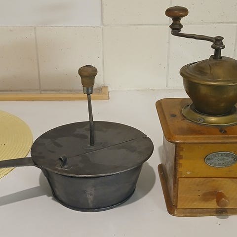 Vanha käsikäyttöinen kahvimylly puu- ja metalliosilla