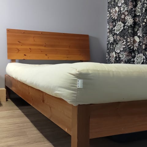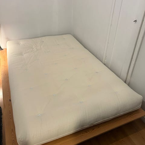 Myydään 120 cm leveä futonpatja, jossa on päällinen puuvillaa ja kookos-luonnonkumitäyte. Patja on yleisilmeeltään siisti, reunoissa voi olla hieman vaaleaan pintaan tarttunutta likaa. Patjassa on säilytyksen jälkeen pinnassa pölyä ja suosittelen imuroimaan sen. Patjassa on hieman kumimainen tuoksu (ehkä johtuu luonnonkumitäytteestä).
