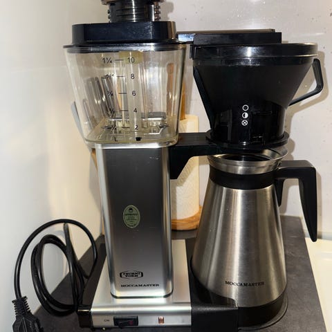 Toimiva moccamaster. Vanhanmallinen, jossa EI ole itsesammuvaa nappia. Ainut miinuspuoli on että aina ei lähde heti käyntiin, vähän kun liikuttaa kahvinkeitintä/ kopauttaa niin lähtee käyntiin. Pannu ja korkki/ kansi ruskeita, muut mustia.