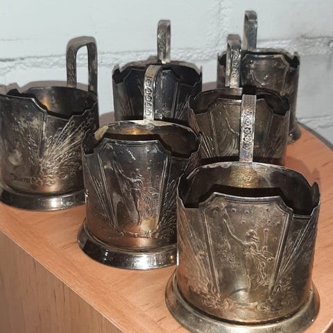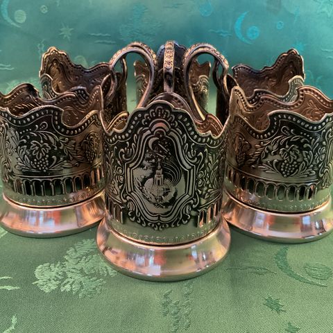 Podstakannik-teelasinpidikkeitä, uus hopeaa. Halkaisija 7.5cm, korkeus 6cm.