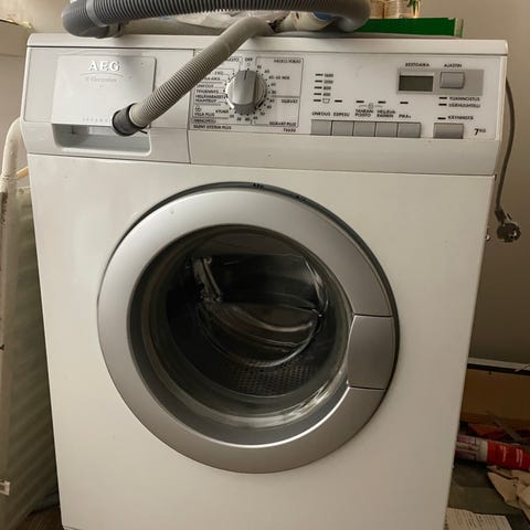 60cm leveä, 5kg täyttö pesukone. Pitää ostaa erikseen uusi veden sisääntuloletku. Muuten toimii.