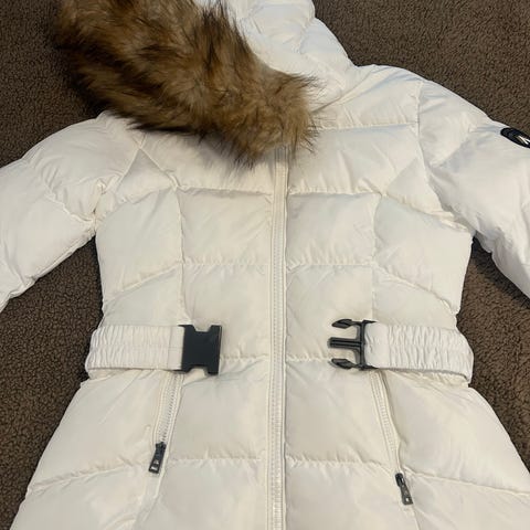 Super dry kiva topattu valkoinen takki, hihat siniharmaata neulosta. Edessä molemmin puolin vetoketjutaskut. Koko 38. Siisti ja ehjä + vetoketjut toimii. K-K 50, O-H 63.