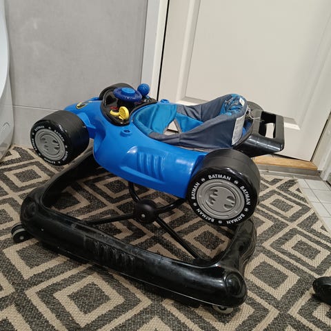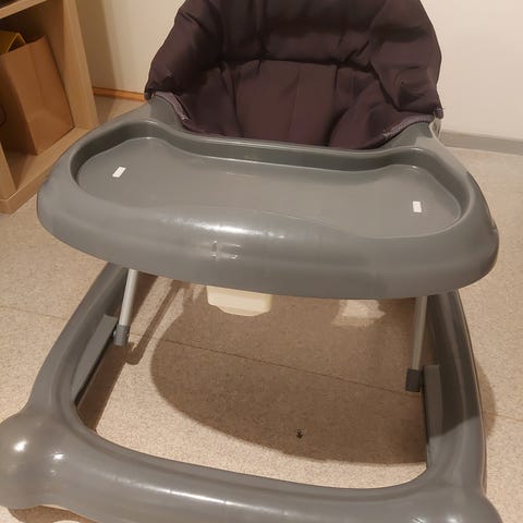 Istuinkorkeus on säädettävissä ja päällinen on irrotettava pesua varten. Mukana on leikkipaneeli, jossa on leluja lapsen leikkimiseen.
