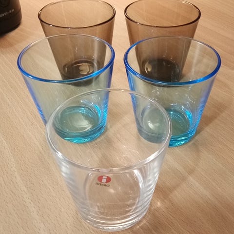 Käytössä olleet 7 kpl iittalan kartio laseja. Yhdessä iittalan tarra. On käytön kulumaa muttei mitään lohkeamia tai säröjä.