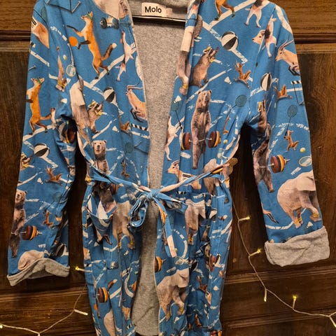 Molo kylpytakki / aamutakki, koko 122/128 cm. Printti ”Athletic Animals”. Mukavan pehmoinen. Merkille tyypillisesti hieman haalistumaa mutta muutoin hyväkuntoinen. Nouto Länsi-Pakilasta tai +pk.