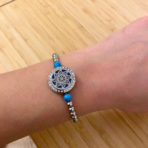 Puhdas+ Aroma Diffuser Ultra Sonic -tuote, joka toimii ultraäänitekniikalla. Mukana on lisäksi Puhdas+ Essential Oil -eteerinen öljy appelsiini ja kaula koru jossa värillisiä huopanappeja, johon tuoksu imeytyy. Käyttämättömät