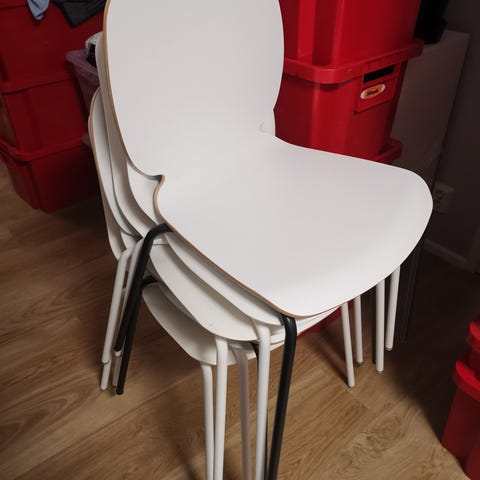 Myydään muuton vuoksi 6kpl valkoisia tuoleja. Alkuperäiseltä väriltään olleet puunväriset,maalattu kalustemaalilla valkoisiksi. Käytön jälkiä löytyy (esim. kolhuja ja värjäytymää istuinosissa)