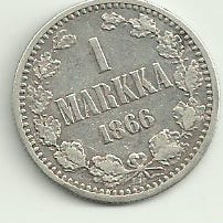 Suomi 1 Markka -hopearaha, vuosimalli 1892. Kolikko on valmistettu hopeasta ja esittää arvon 1 markka. Kolikon toisella puolella on koristeellinen lehtikuvio, toisella puolella on Venäjän keisarikunnan vaakuna ja teksti. hinta 10 e posti 2.50 e