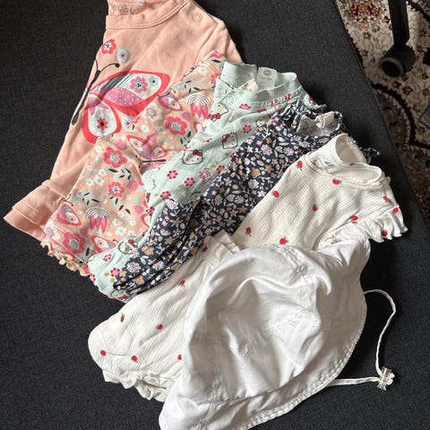 Vaatepaketti 62-68-74. Tytön kesävaatteita. Kaikki on pesty hajusteettomalla pesuaineella, savuton ja eläimetön talous.