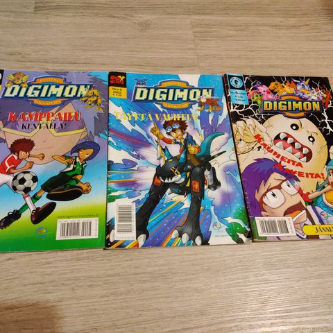 Kaksi Digimon sarjakuvaa, joissa eri kansikuvitukset. Sarjakuvat sisältävät Digimon-hahmoja ja seikkailuja.