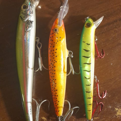 Kolme Rapalan vaappua muikku-värissä. Ylimmäisen pituus 9cm, keskellä 7cm, alhaalla 5cm. Ylimmäistä lukuunottamatta vaaput ovat vanhaa Suomalaista tekoa. Hintaa 16€+postit. Myös nouto Kuopiosta onnistuu.