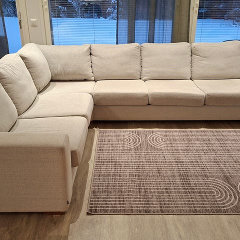 Istuintyynyjen alla oleva kangas kulunut ja nyppääntynyt mutta tämä ei näy ulospäin. Sohva vasta pesty tekstiilipesurilla. Kuvasta puuttuu yksi sohvatyyny joka myös kuuluu kauppaan. Myynti muuton vuoksi