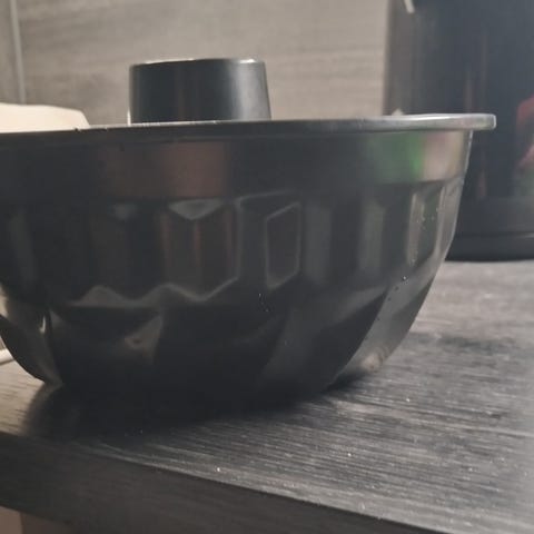 Metallinen sydämenmuotoinen kakkuvuoka vaaleanpunaisella ulkopuolella ja mustalla sisäpinnalla.