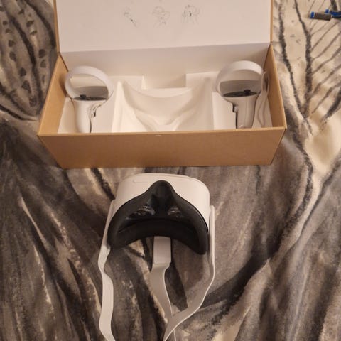 Oculus Quest 2 VR-lasit valkoisena sisältävät virtalähteen, latauskaapelin ja kaksi ohjainta. Laite soveltuu virtuaalitodellisuuskokemuksiin , sekä pelaamiseen ja sisältää tarvittavat lisävarusteet käyttöä varten. kaikki alkuperäiset tavarat löytyy , vähälle käytölle jäänyt siksi myynnissä , hinta ei ole kiveen hakattu.