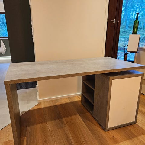Pöydän pinnassa on pieniä käytön jälkiä. Laatikostojen kahvoissa on hieman kulumaa, mutta ne toimivat moitteettomasti. Yleisilmeeltään pöytä on siisti ja käyttökelpoinen.Kuvattu rullien päällä, jotka eivät kuulu mukaan.