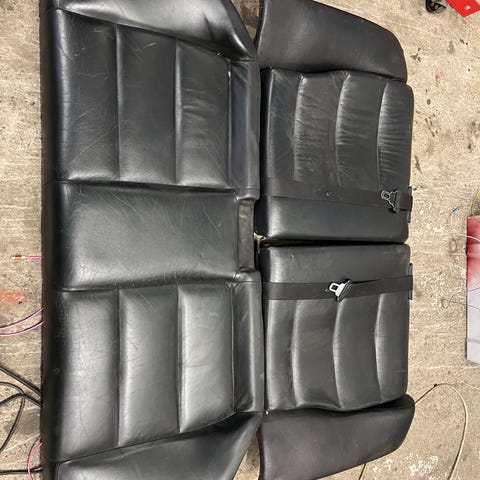 Auton penkit harmaalla kankaalla. Penkeissä näkyy käytön jälkiä ja kulumia, kuten repeämiä ja tahroja. Soveltuvat auton sisätilojen korjaukseen tai varaosiksi.
