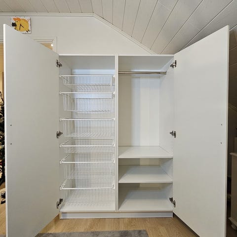 Valkoinen matalaan tilaan valmistettu hyväkuntoinen vaatekaappi 120 cm leveä