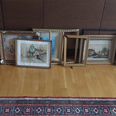 13 erilaista, eri-ikäistä ja -kokoista taulun kehystä, osassa kuva mukana