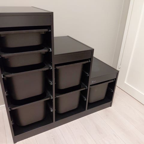 IKEA Trofast säilytyskaluste, valkoinen väri. Kalusteessa on kuusi lokeroa, joissa on irrotettavat valkoiset säilytyslaatikot. Soveltuu lastenhuoneeseen tai muuhun tilaan säilytykseen.