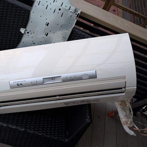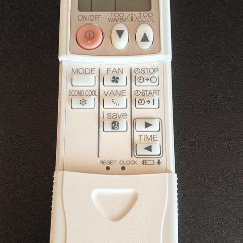 Toshiba H-H07JE ilmalämpöpumpun kaukosäädin. Ollut n. 13 vuotta vanhan Toshiba Daisekai pumpun säätimenä. Kulkeutuu Turun ja Hämeenlinnan välillä omien menojen mukana