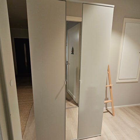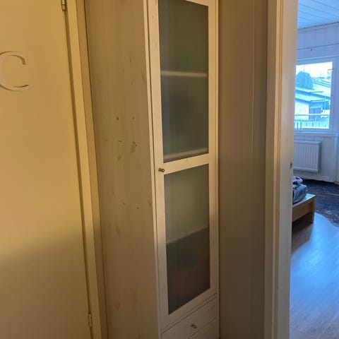 Nysjön korkea kaappi, valkoinen 30x190cm ja Nysjön pesukonekaappi, valkoinen 65x190cm.
